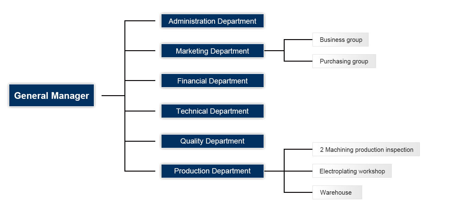 ? ? ? The company‘s organizational structure: the General Manager is in charge, six departments, namely, administration department , marketing department, financial department, technical department, quality department, and production department, and we have three workshops, two warehouses. There are more than 200 employees, including 32 management personnel, 8 technicians and 12 inspectors.